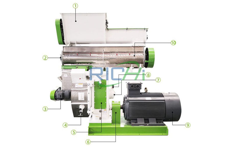 To operate the peanut shell pellet machine, you need to feed the raw materials into the feeder, the raw materials passing through the conditioner enter the pelletizing chamber, and finally form pellets under the action of the ring die and the pressure roller.